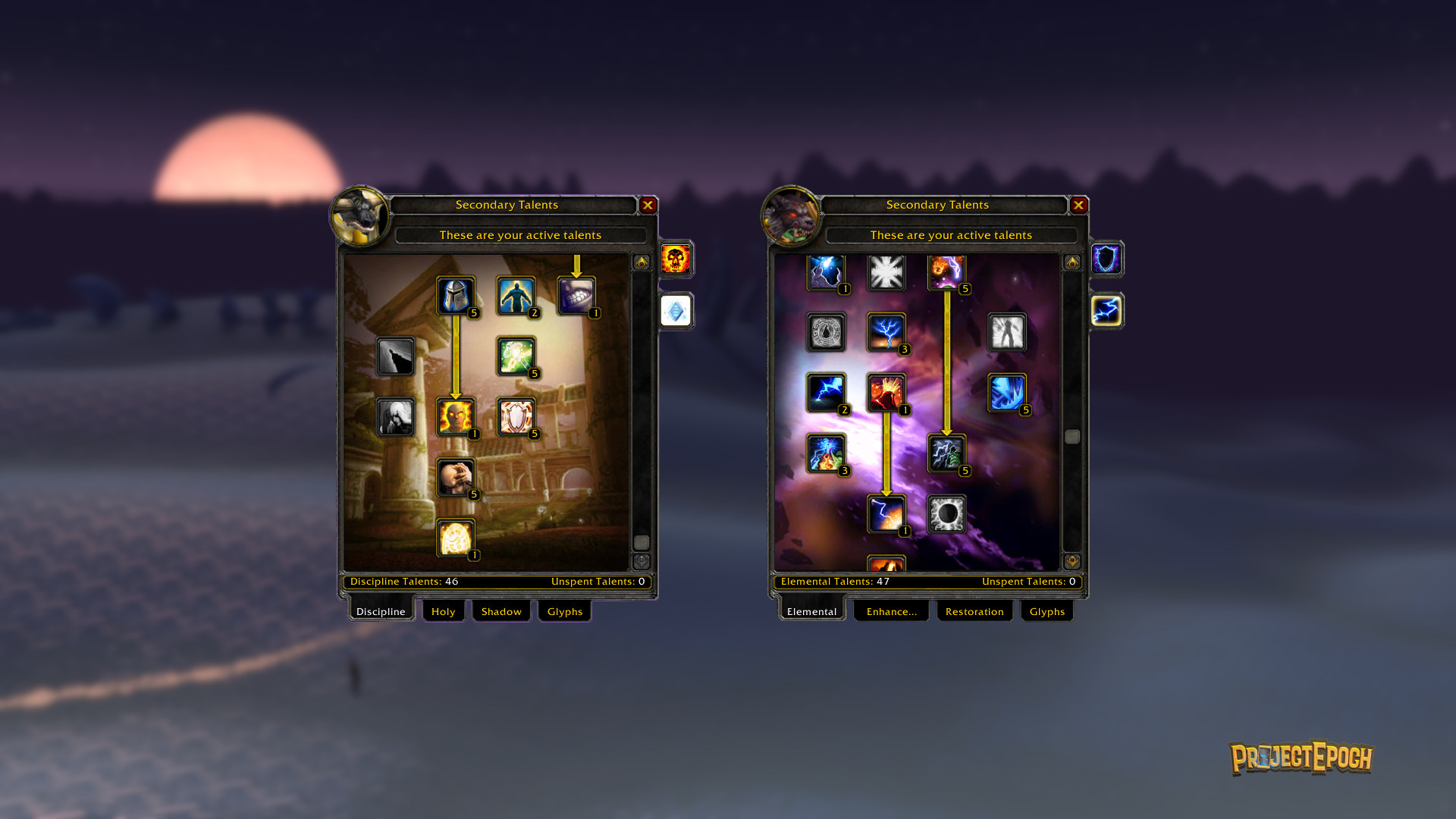 Project Epoch retains the depth of The Burning Crusade's expanded talent trees, but reimagines how players grow into them. Instead of stopping at the classic 51 points by level 60, players will now earn a total of 61 talent points at carefully chosen intervals from level 14 through 60.