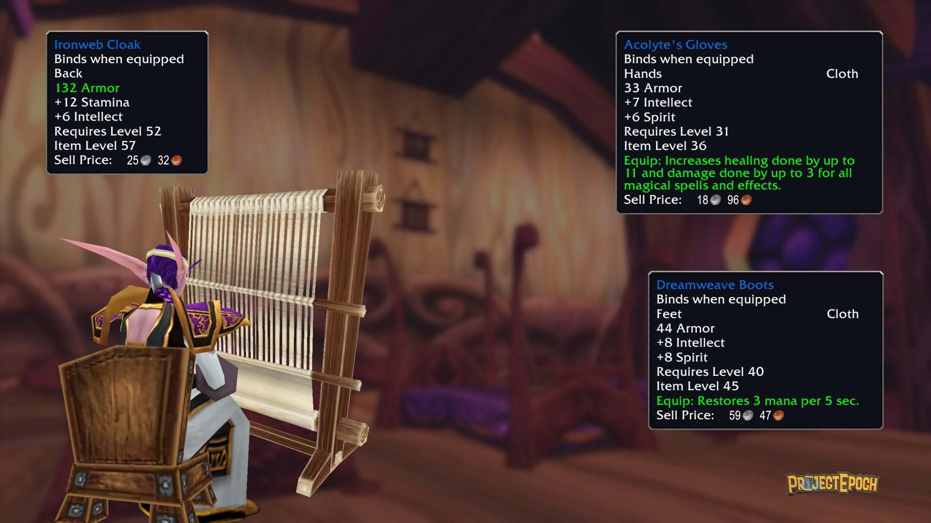 Tailoring weaves elegance and function together, turning bolts of cloth into robes, bags, and battle regalia. At Epoch, we've given new life to the loom, expanding cloth armor sets and utility items like cloaks while retaining the timeless charm of this cornerstone profession.