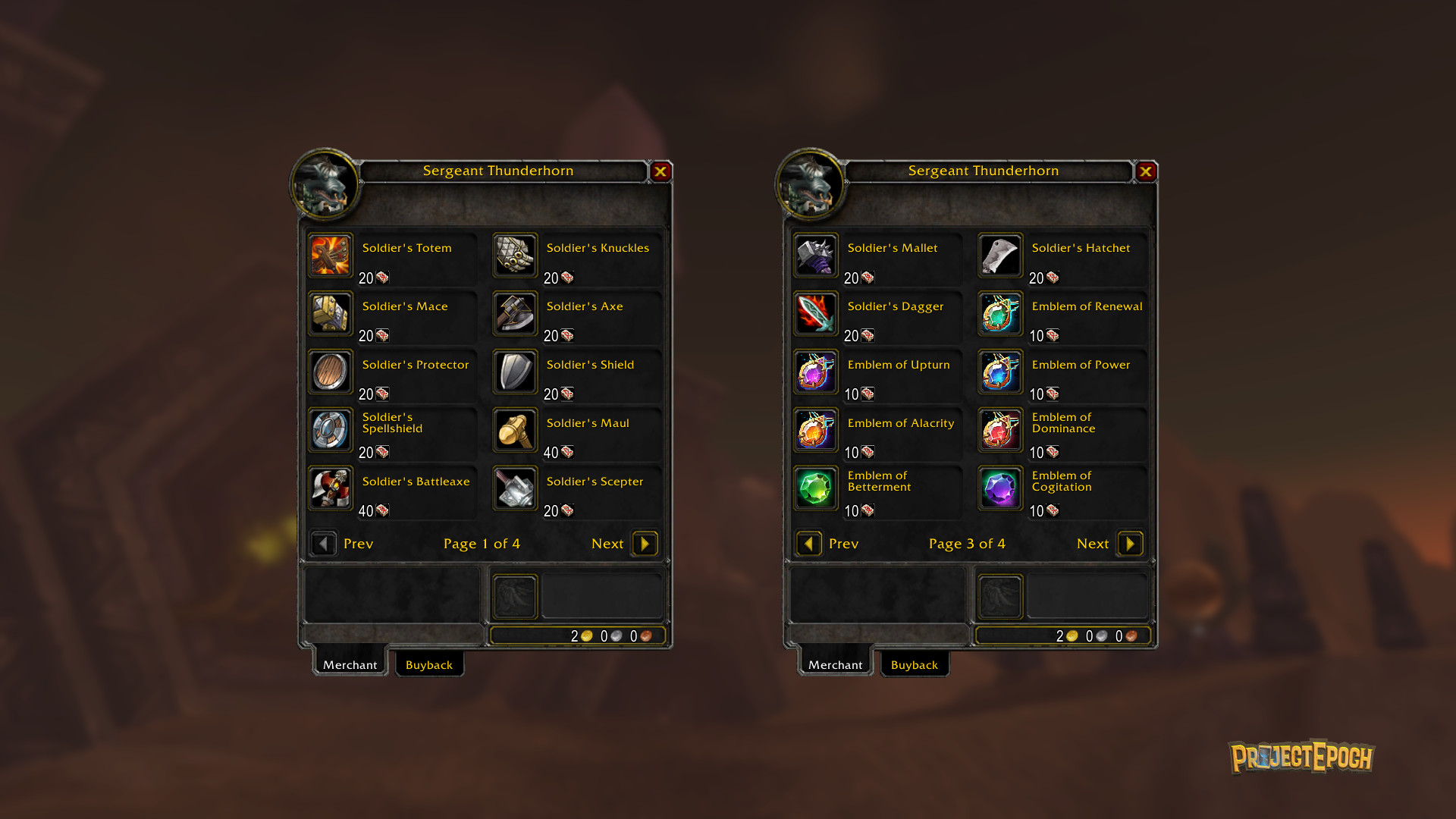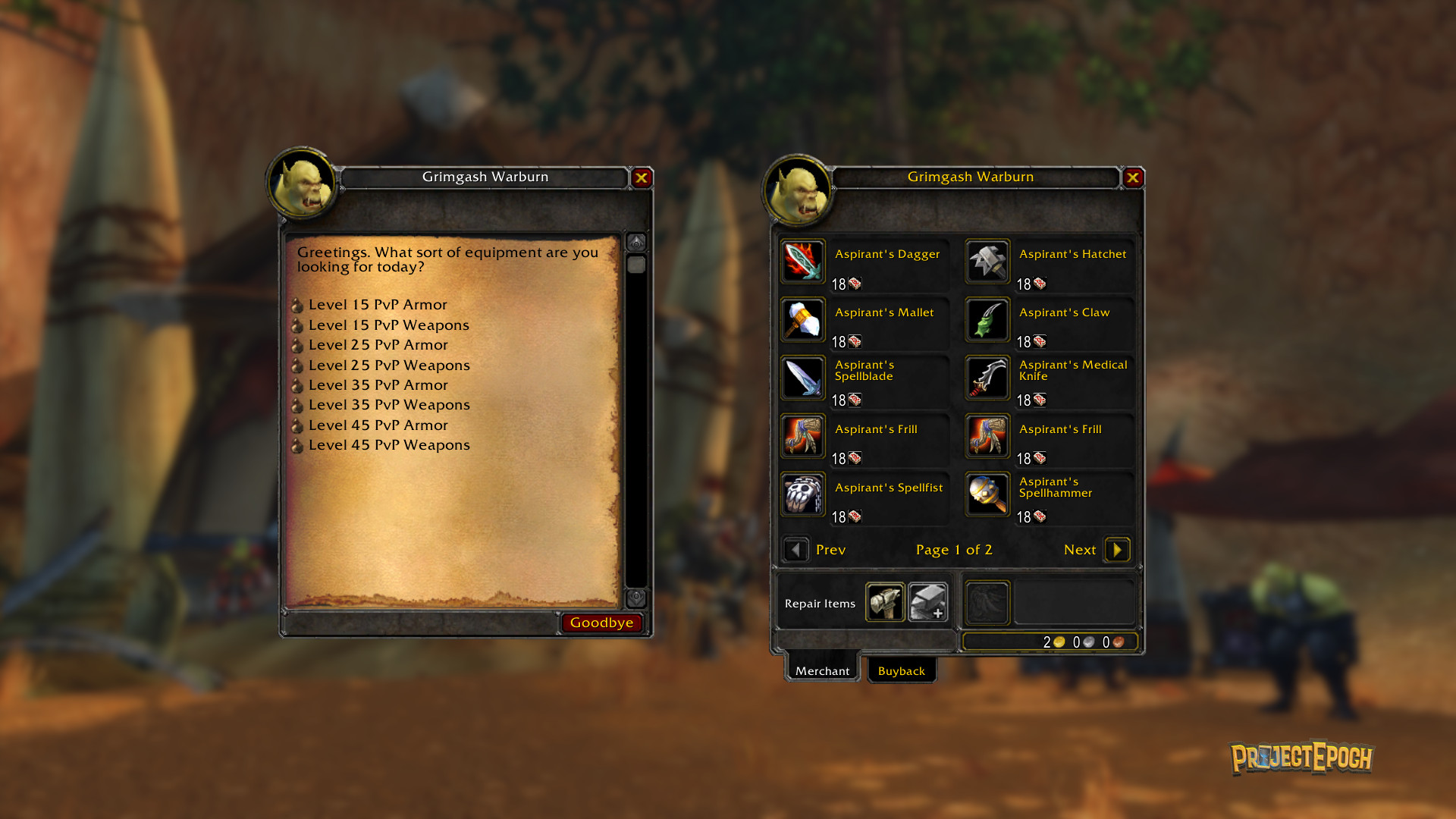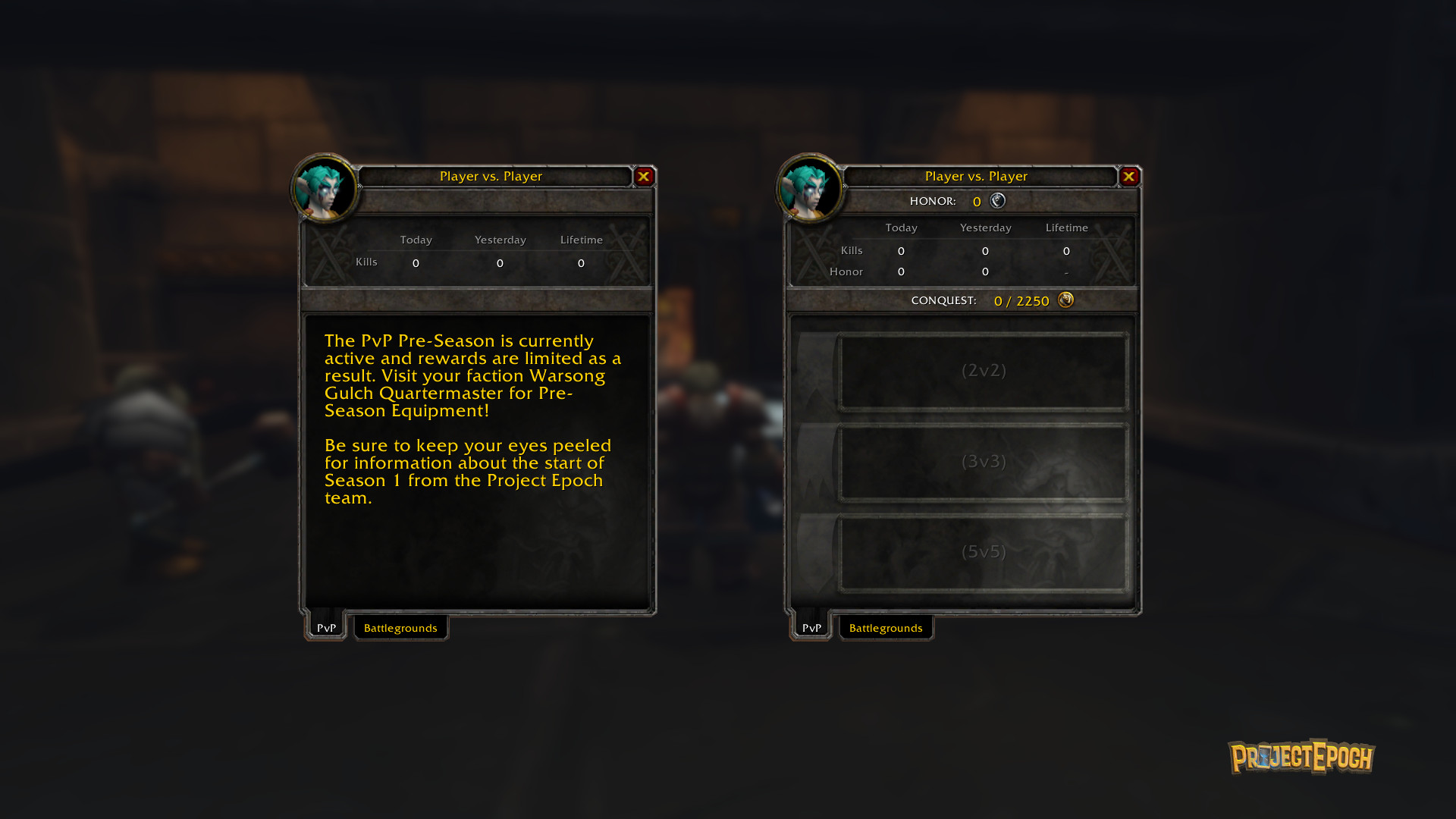 With the release of Project Epoch the server will be in a "Pre-Season" state awaiting the start of Season 1 a number of weeks later. This gives players time to level up and get a good feel for their class. During this Pre-Season state you will be unable to obtain most currencies, but there are Pre-Season rare quality PvP sets to obtain from the only Battleground at this time, Warsong Gulch.