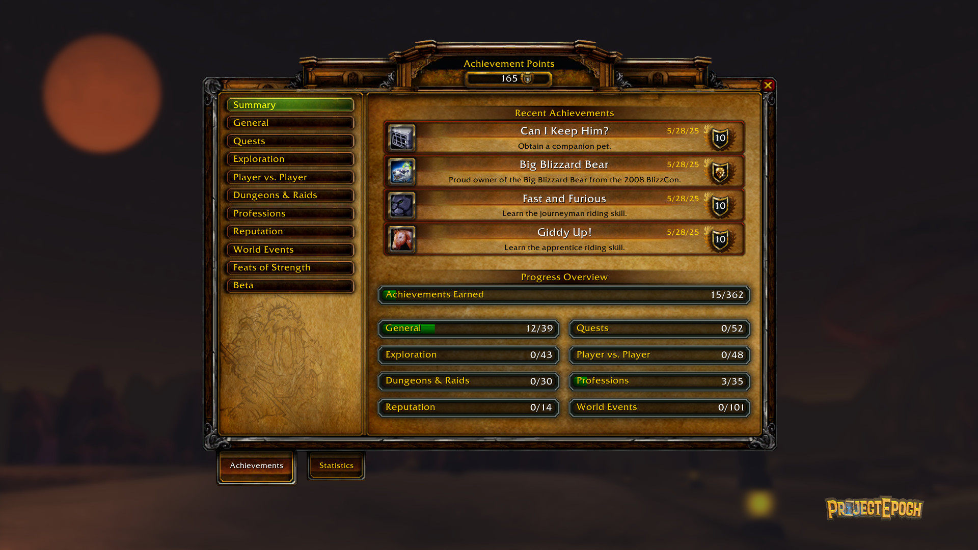 The Achievement system from Wrath of the Lich King lives on, but not without careful attention. We've meticulously reworked or removed Blizzard's original achievements to ensure they align with a Vanilla-themed world, preserving immersion and consistency. On top of this, you'll discover entirely new achievements and feats of strength crafted around Project Epoch's unique content, offering fresh challenges and rewarding milestones for dedicated explorers, collectors, and champions alike.