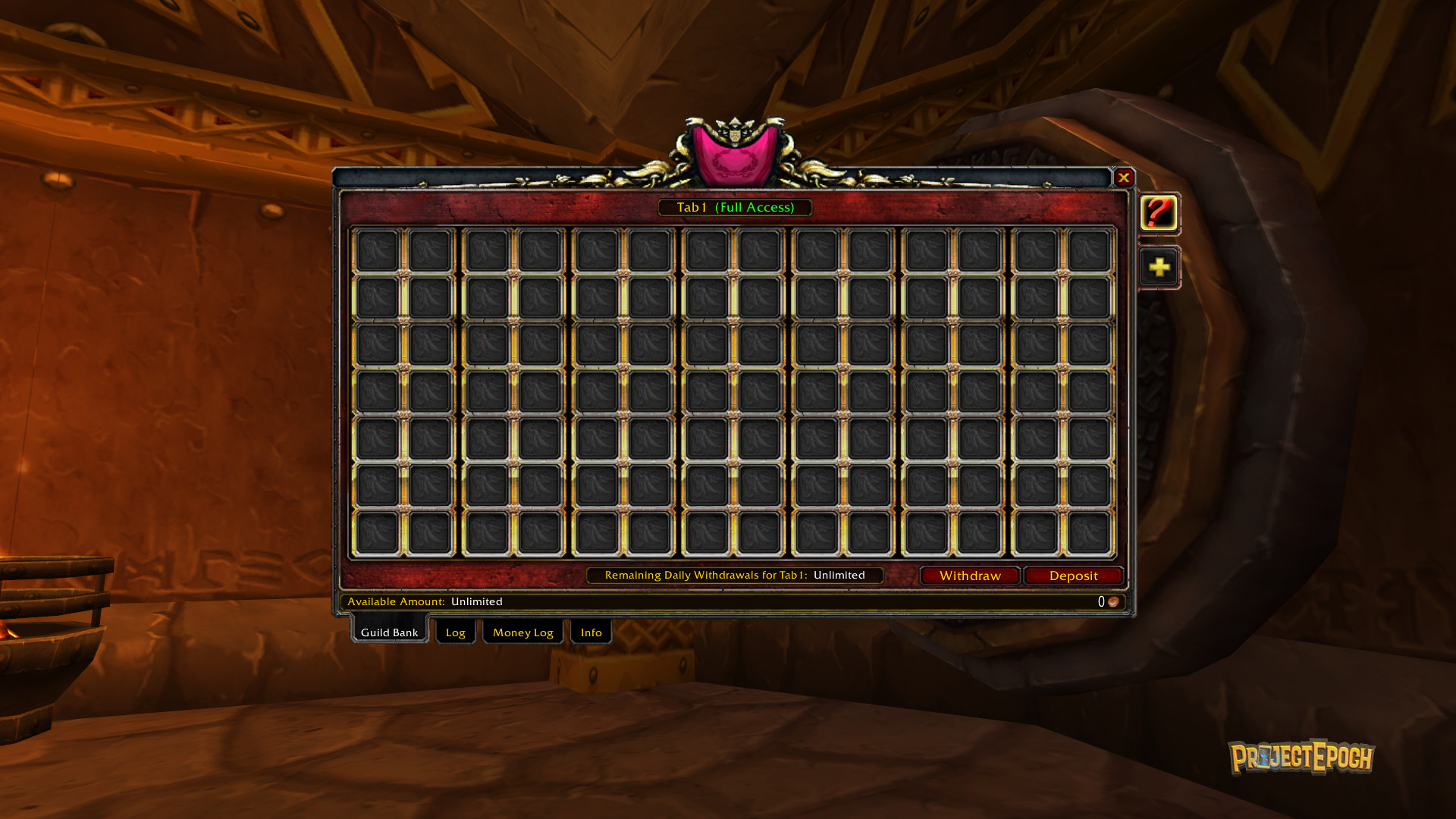 Project Epoch retains the Guild Bank system introduced in The Burning Crusade, offering shared storage space for guild members to deposit, organize, and withdraw items with customizable permissions — a major quality-of-life upgrade over the Vanilla experience. We've also preserved the additional personal bank slot available in later clients, giving players just a bit more room to manage their growing collections and treasures.