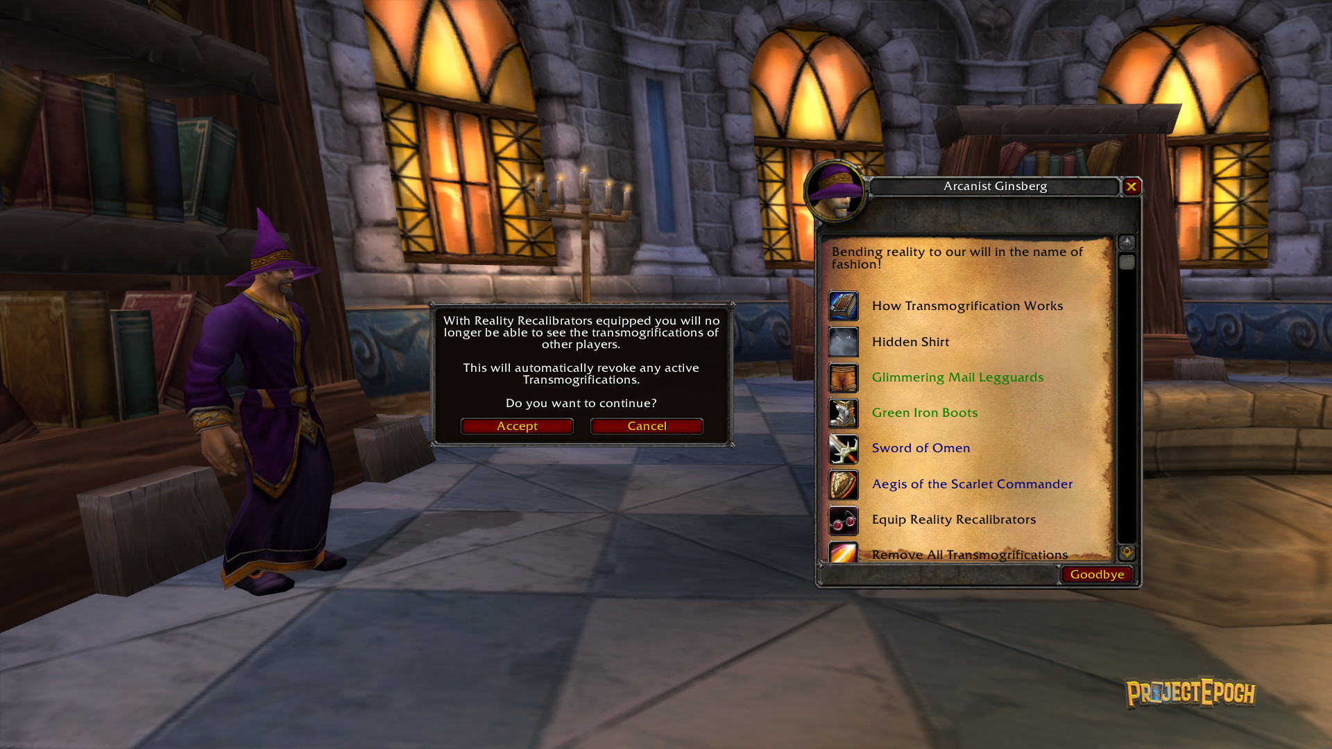 But not everyone enjoys a world awash in mismatched sets and flashy illusions. For those who prefer a grounded, authentic visual experience, a visit to the Transmogrifier lets you disable all player Transmogrifications, ensuring the world around you stays raw, unembellished, and true to its natural form.