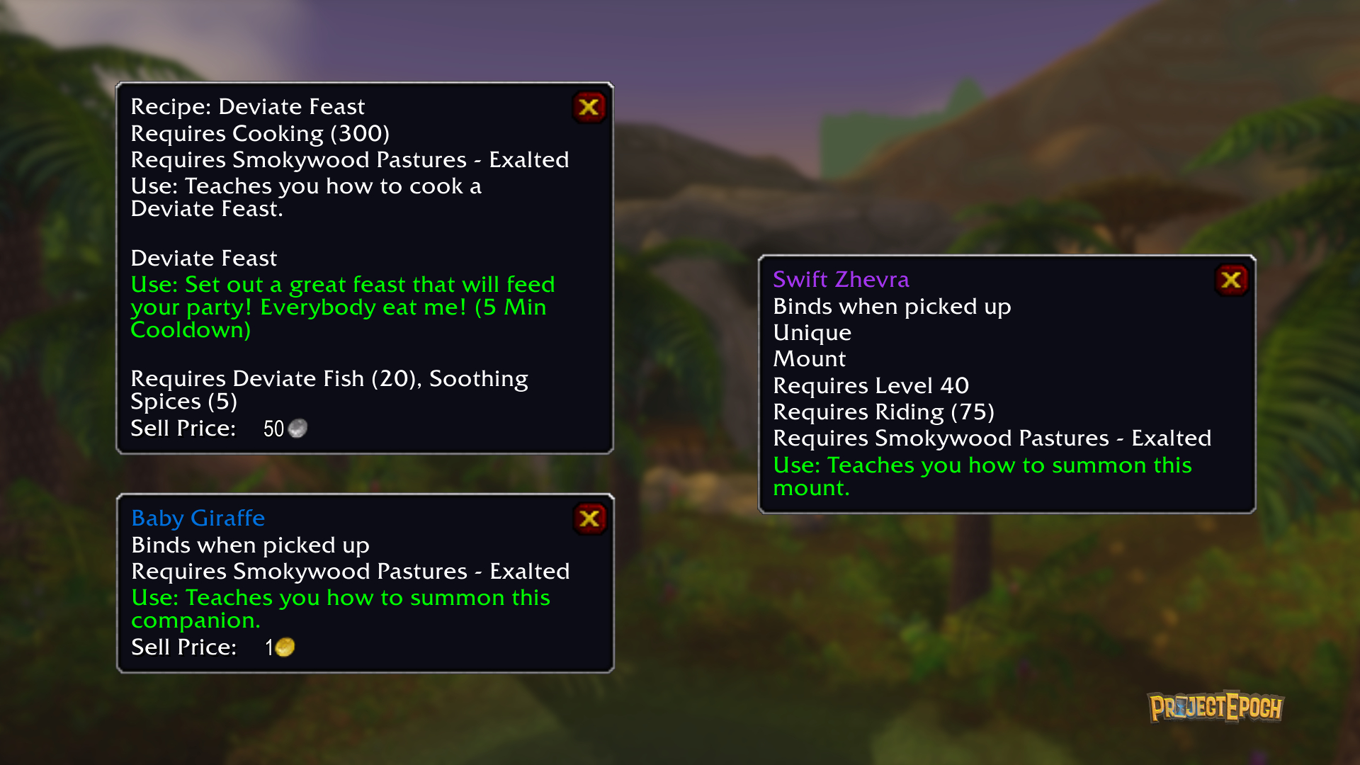 Reaching the highest standing with Smokywood Pastures grants access to a unique mount, an exotic pet, and a special cooking recipe.